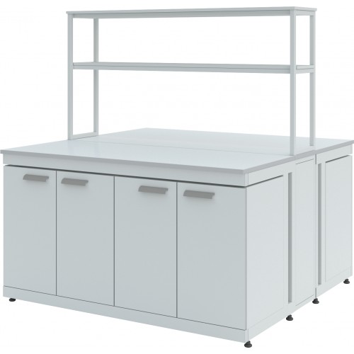 Стол островной ЛК-1800 СО состоит из прочного сборно-разборного металлического каркаса с полимерным покрытием серого цвета, технологической приставки с двумя полками из стали и столешницы.