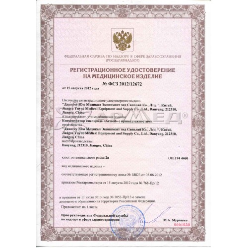 Концентрация кислорода на выходе (при производительности не более 1 л/мин): ≥ 90%