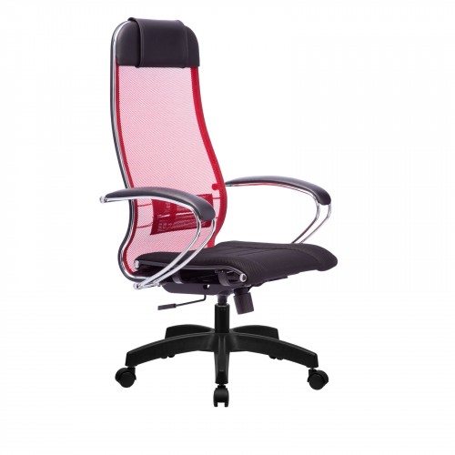 - красная спинка с черными накладками подлокотника и черным сиденьем.