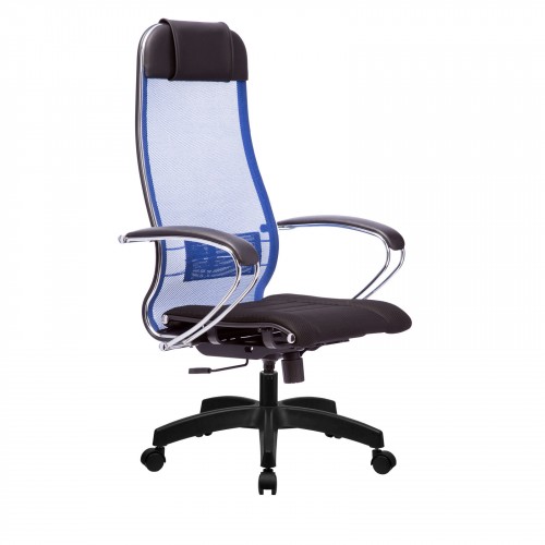 - синяя спинка с белыми накладками подлокотника и белым сиденьем;